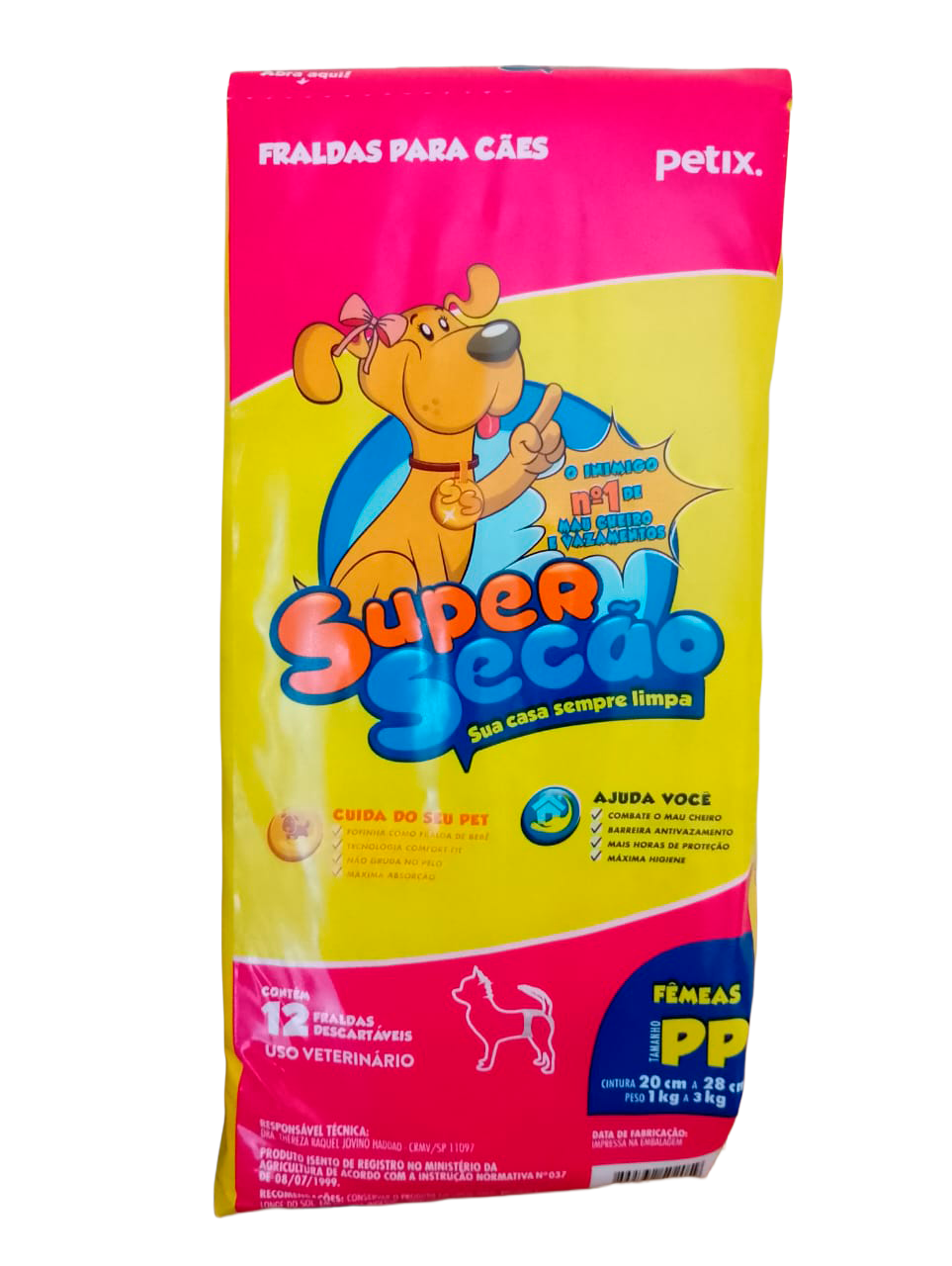 As Fraldas Descartáveis SuperSecão chegaram! São fraldas especialmente desenvolvidas para cães: não grudam no pelo, não vazam, e servem perfeitamente em seu pet, evitando desconforto! A nova fralda descartável SuperSecão para fêmeas possui tecnologia inédita na cinta, que evita que a fralda escorregue e caia.